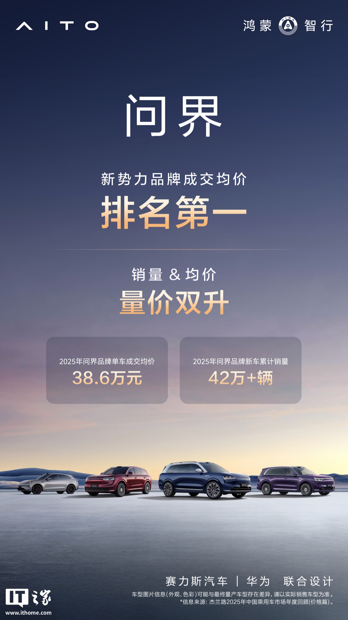 IT之家 2 月 3 日消息,问界汽车官方今日宣布,2025 年问界单车成交均价 38.6 万元,达新势力品牌 TOP1,同时全年累计销量超 42 万辆。