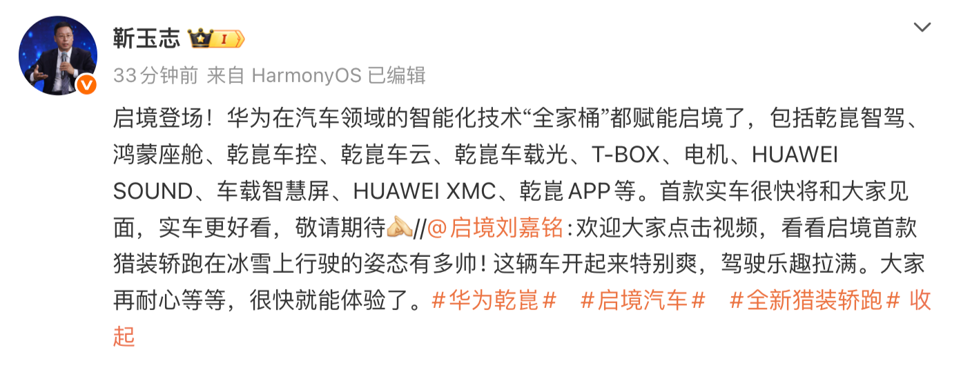 凤凰网科技讯 2月3日,华为智能汽车解决方案BU CEO靳玉志发文谈启境首款猎装轿跑。他称,“华为在汽车领域的智能化技术“全家桶”都赋能启境了,包括乾崑智驾、鸿蒙座舱、乾崑车控、乾崑车云、乾崑车载光、T-BOX、电机、HUAWEI SOUND、车载智慧屏、HUAWEI XMC、乾崑APP等,首款实车很快将和大家见面。”