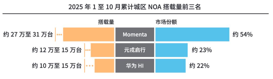 落地重点转向,行业格局也随之大变,出现了头部效应。2025年1月-10月,华为HI(《白皮书》注:指华为在鸿蒙智行“五界”车型之外)、元戎启行、Momenta成为累计城区NOA搭载量前三名,合计拿下市场超九成份额。