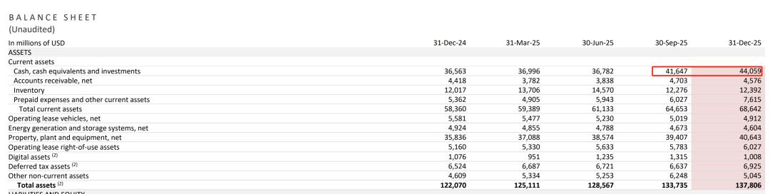 但幸好特斯拉口袋还有钱。截至2025年第四季度末,特斯拉现金、现金等价物及投资总额也达到441亿美元(约合人民币3063亿元),环比增加24亿美元。