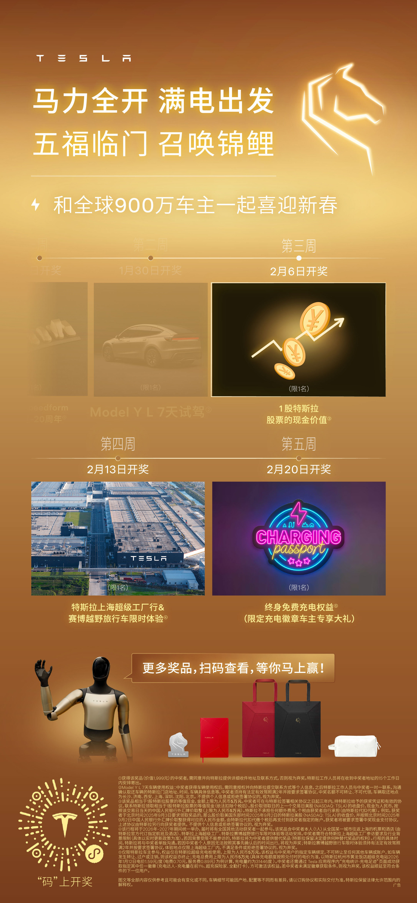 特斯拉中国官方微博周日发布消息:马力全开,满电出发,五福临门,召唤锦鲤,和全球 900 万车主一起喜迎新春。