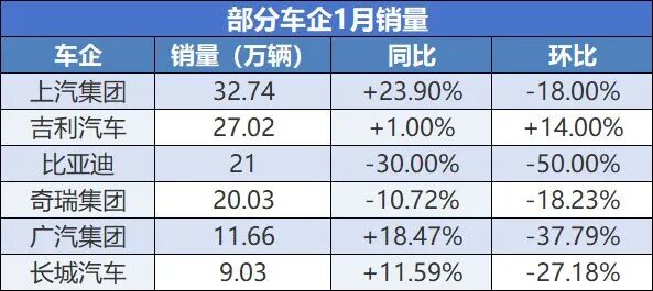 此外,比亚迪在1月销量为21万辆,同比减少约30%,环比下降50%。长城汽车1月销量约为9.03万辆,同比增加11.59%,环比下降27.18%。奇瑞集团1月销售20.03万辆,同比下滑10.72%,环比下降18.23%。