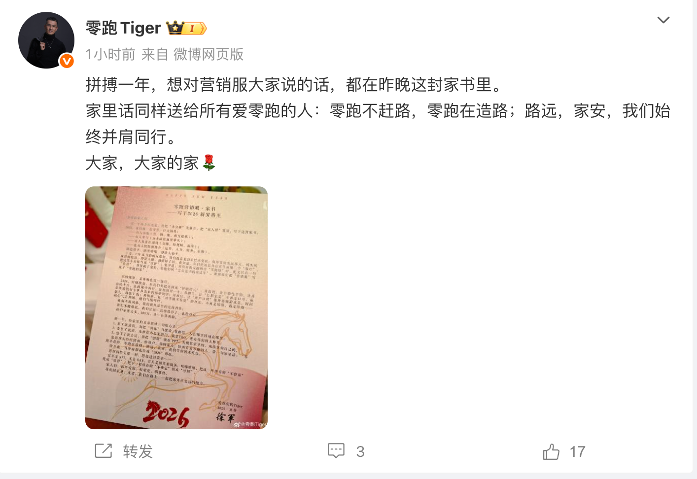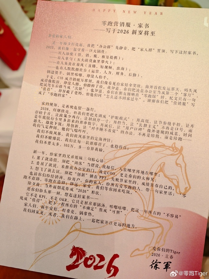 凤凰网科技讯 2月5日,零跑COO徐军在写给营销服的新年家书中提到,“2026年,我们要用高效,让节奏慢半拍,让库存轻十斤,让政策少两行,让利润厚一寸。用创新,让‘对手睡不着觉’的办法,不再是陪熬,而是陪跑——我们气定种闲,他们气需吁吁。我们不要太多,105万,多一台算我输。”