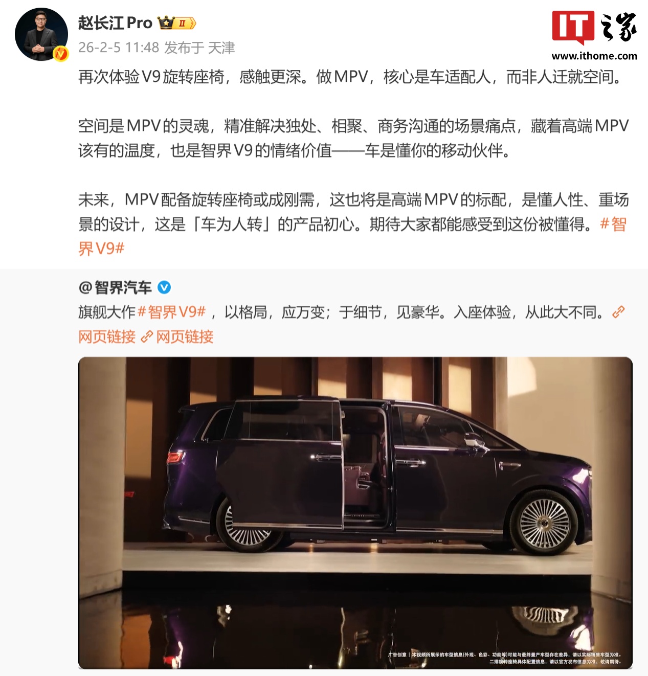 IT之家注意到,智界汽车执行董事及执行副总裁赵长江今日发表了自己对于 MPV 空间的看法。他表示,做 MPV,核心是车适配人,而非人迁就空间。