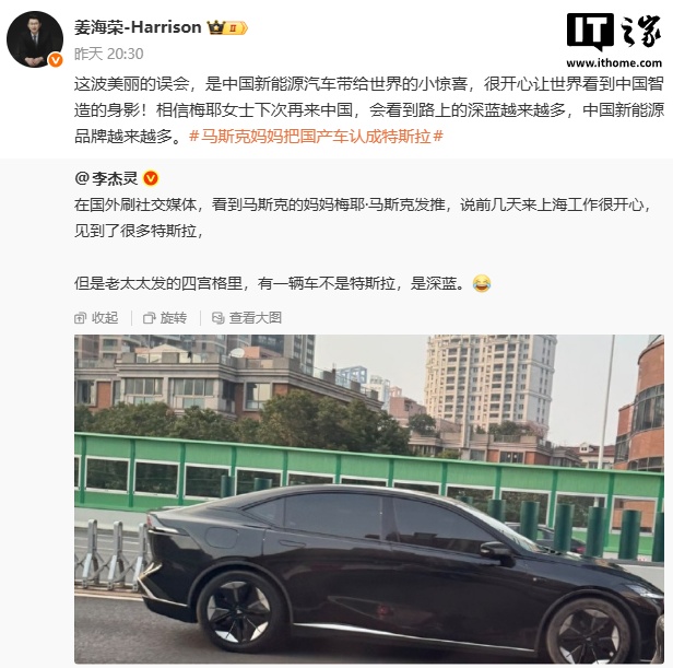 2 月 4 日,深蓝汽车 CEO 姜海荣转发了相关内容,并配文称:“这波美丽的误会,是中国新能源汽车带给世界的小惊喜,很开心让世界看到中国智造的身影!相信梅耶女士下次再来中国,会看到路上的深蓝越来越多,中国新能源品牌越来越多。”