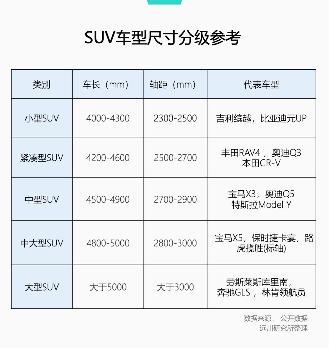 汽车尺寸分级标准没有严格规定,按照约定俗成的划分方式,中大型SUV车长介于4.8-5米,轴距介于2.8-3米。大型SUV的车长超过5米,轴距超过3米。