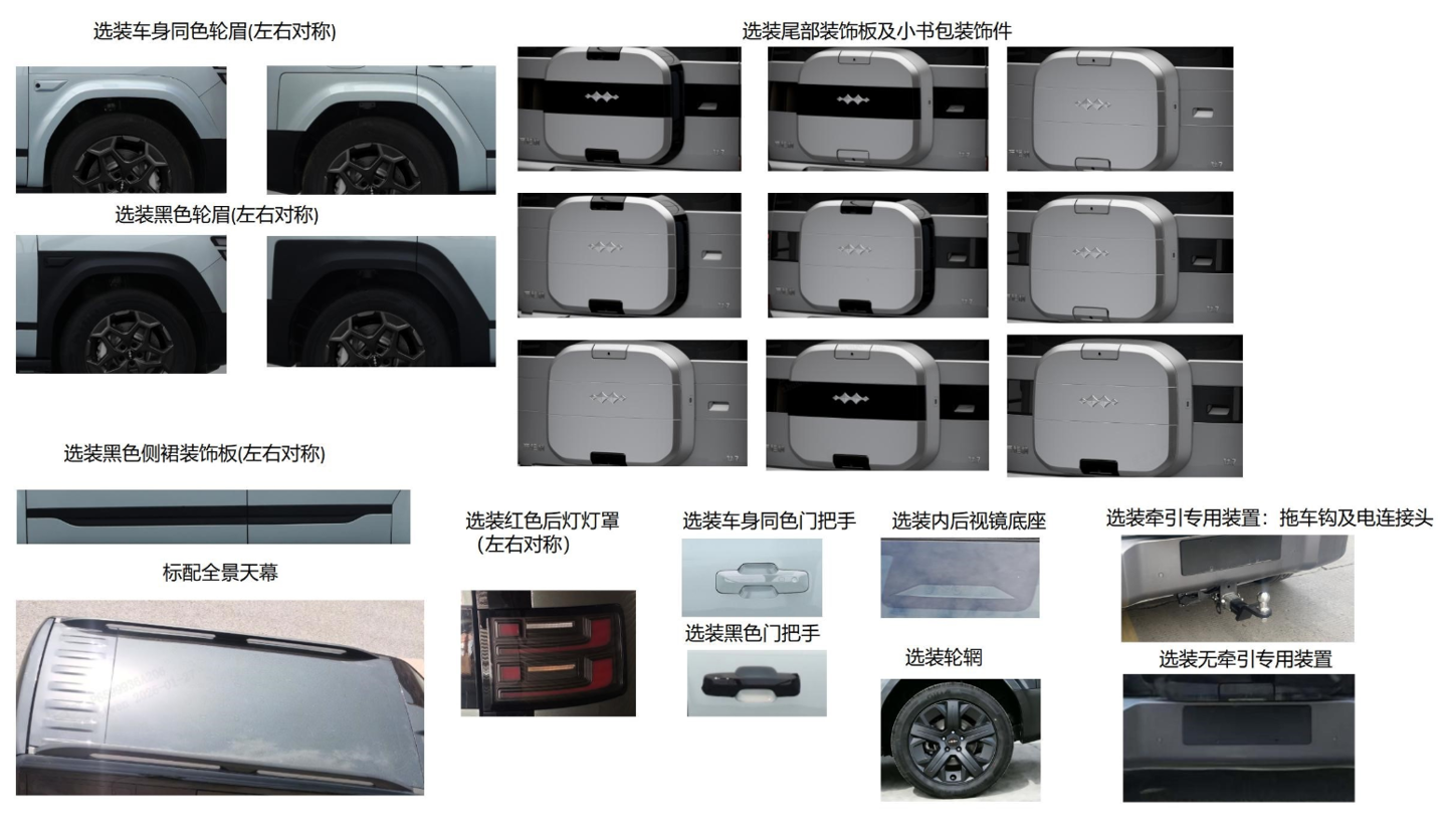 该车标配全景天幕,可选激光雷达、拖车钩。