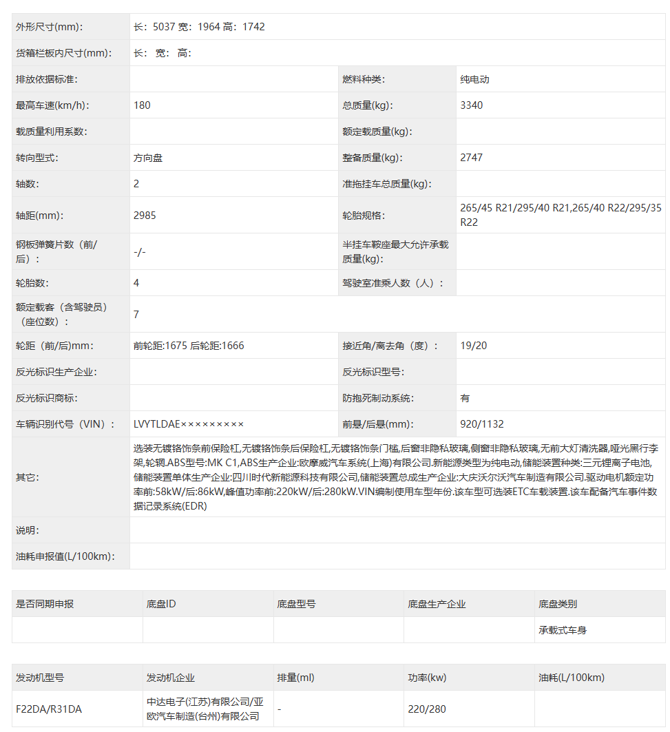 IT之家从申报信息获悉,这款新车延续了家族式外观设计,车身尺寸为 5037/1964/1742 mm,轴距 2985 mm。该车提供四驱动力系统,其中高功率版搭载前 220 kW、后 280 kW 双电机;低功率版搭载前 130 kW、后 200 kW 电机。