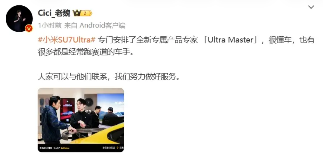 去年2月初,SU7 Ultra尚处于发售前的最后预热阶段,小米中国区市场部总经理魏思琪就曾发文透露,小米汽车为SU7 Ultra车型专门安排了全新专属产品专家“Ultra Master”。