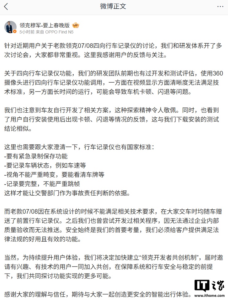 IT之家 2 月 7 日消息,今日,领克汽车销售有限公司副总经理穆军发文回应老款领克 07/08 四向行车记录仪争议。