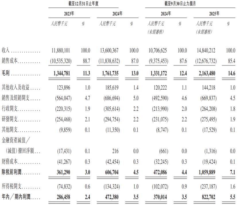 财务数据方面,2023年、2024年及2025年前三季度,公司分别实现营收118.80亿元、136.00亿元、148.40亿元,同期净利润分别为2.87亿元、4.72亿元、8.23亿元。