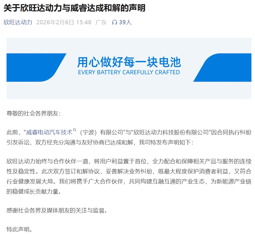 2月6日,欣旺达动力发布《关于欣旺达动力与威睿达成和解的声明》,公司与威睿之间的合同纠纷案件迎来重要进展,双方已通过友好协商达成和解。