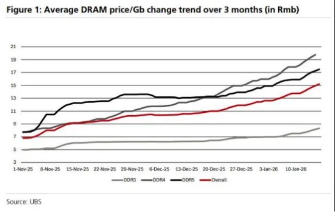 报告数据显示,汽车应用领域的DRAM价格在三个月内暴涨180%,富国银行指出,DDR5现货价格较2024年平均水平高出8倍以上,DDR4价格更是高出16倍,车规级DRAM本就因需满足耐温、抗震、高可靠性的严苛标准,价格高于消费级产品,而汽车行业在全球DRAM市场中份额不足10%,部分数据显示这一比例甚至仅为3%,薄弱的议价能力让车企难以抵御芯片涨价的压力。