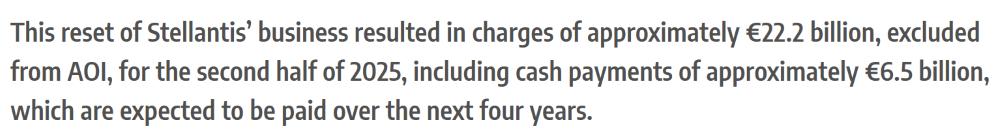 产生如此巨额亏损的主要原因就是Stellantis集团的业务重组计划,根据Stellantis方面在公告中的说法,此次Stellantis业务重组导致约222亿欧元(约合人民币1824亿元)的费用。