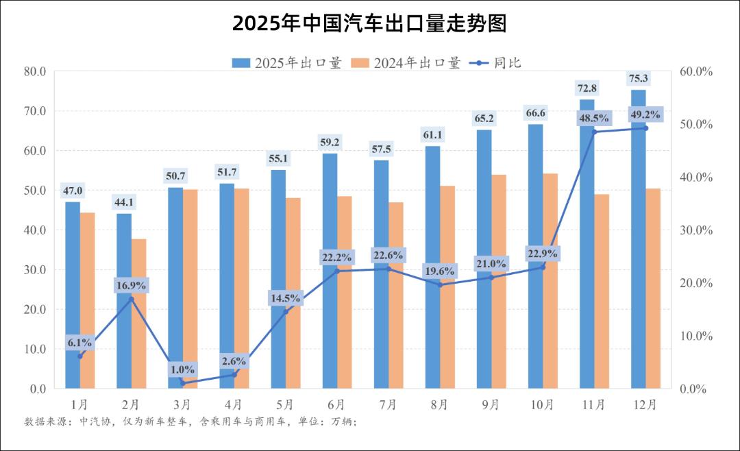 更早的时候,中欧汽车贸易争端软着陆,为中国汽车出口再次保驾护航。中国汽车在欧洲去年实现810,982辆销量,占欧洲1330万辆销量的6.1%,同比2024年增幅超过99%,其中去年12月份10.98万辆的惊人增幅,让大众、雷诺和菲亚特等欧洲老钱惊出一身冷汗。