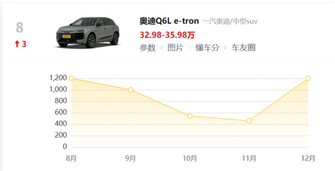 据懂车帝数据显示,奥迪Q6L etron上市后销量持续低续低迷,2025 年 8—12 月销量分别为 1200 辆、1000 辆、542 辆、459 辆、1200 辆,始终未能打开主流市场。