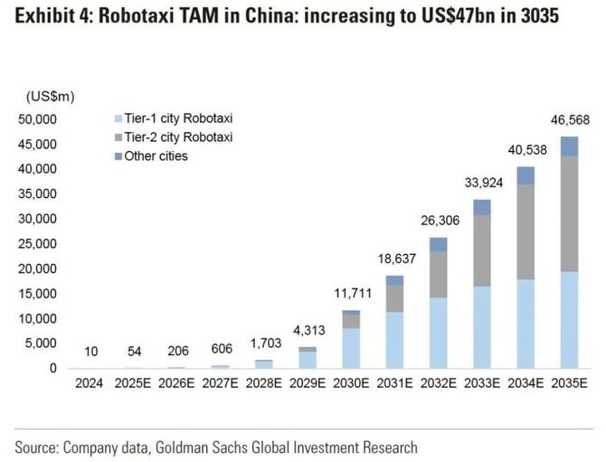 目前,整个Robotaxi行业已经走过了技术验证和商业化试点运营的行业上半场,同时行业也在快速发展着。按照高盛预计,中国Robotaxi市场将从2025年的5400万美元增长至2035年的470亿美元,十年间增长757倍。