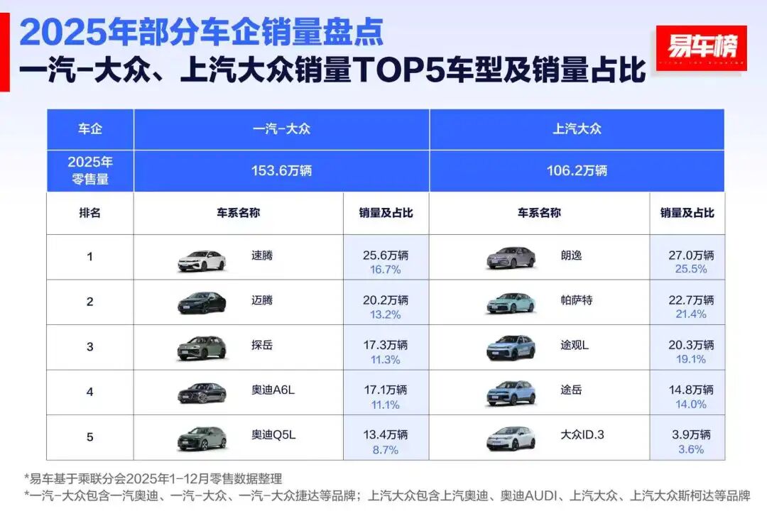 一汽-大众全年累计销量超过150万辆,同比跌幅收窄至4.5%,蝉联合资车企销量第一;上汽大众的跌幅略大,但也成功守住了年销100万辆的大关。