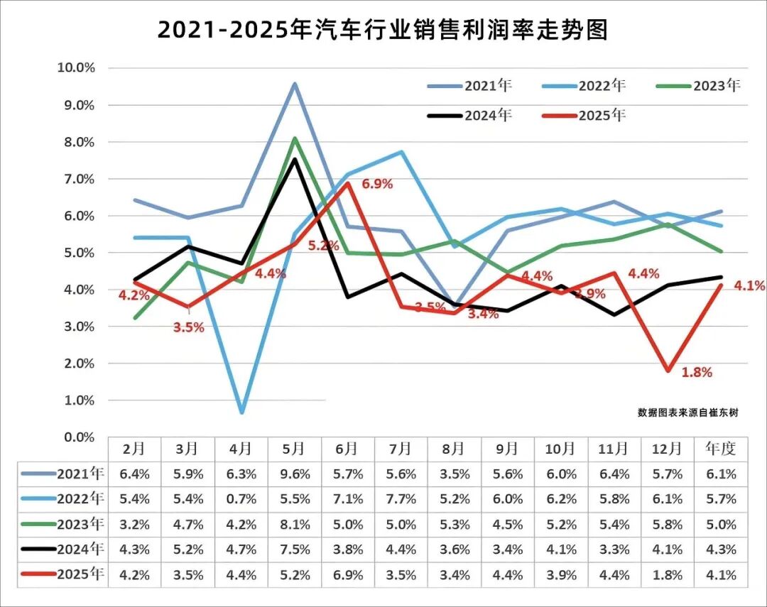 冰冷的数据,更将这一困局刻入现实:2025年中国汽车行业整体利润率仅4.1%, OEM制造环节的盈利水平更是跌破3%。这一数字,与芯片行业35%、电池行业22.41%的高毛利率形成刺眼反差。