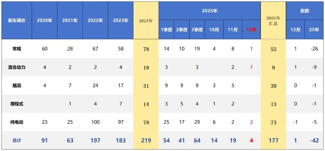 自2022年特斯拉率先大幅降价以来,价格战已从新能源领域全面蔓延至燃油车市场,形成全品类、全价位的竞争红海。2025年177款车型官方降价,全年新能源车均价降幅11%,12月旺季降幅升至14.7%,燃油车全年降幅8.9%;政策退坡加剧年底促销,部分车型最高降价9万元,终端售价持续下探直接侵蚀毛利率。