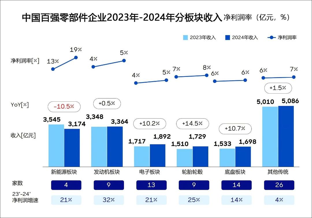 罗兰贝格每年都会发布《全球汽车供应链核心企业竞争力白皮书》,以去年发布的2025版来看,中国百强零部件企业2024年净利润率为8.5%,其中新能源板块以19%一骑绝尘,作为对比,发动机板块仅5%。