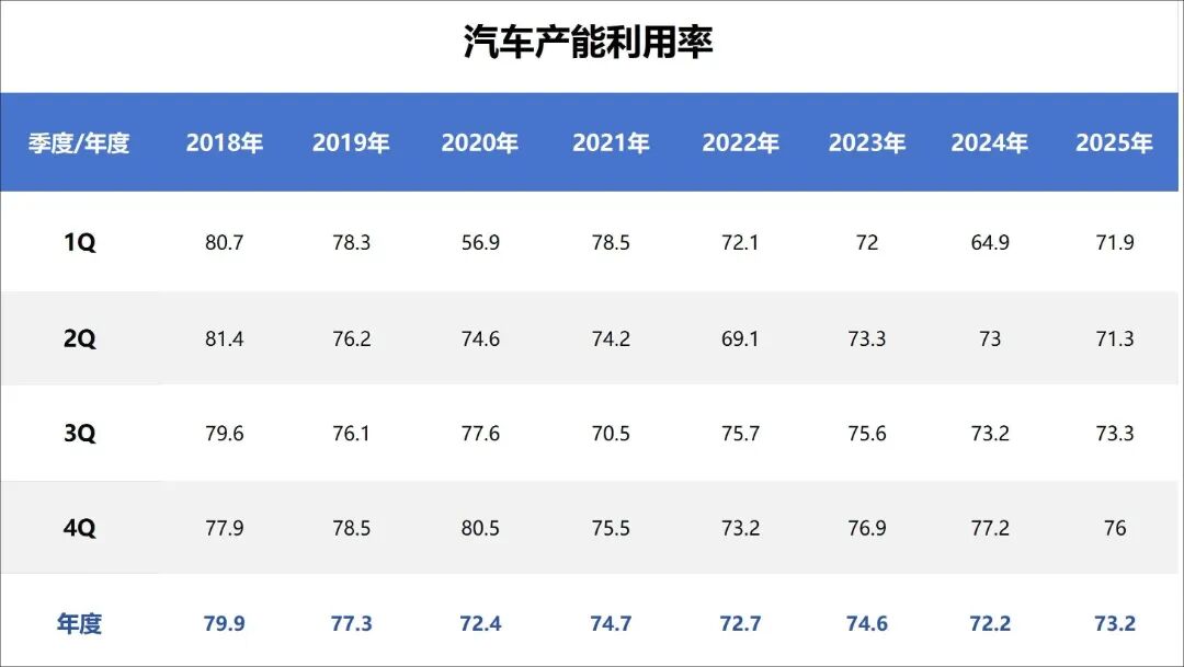 产能利用率低于健康阈值:2025年汽车行业整体产能利用率73.2%,持续低于75%的健康线,合资车企产能利用率仅40%-60%,边缘车企低至10%以下,固定成本分摊效率低,库存高企推高促销费用。