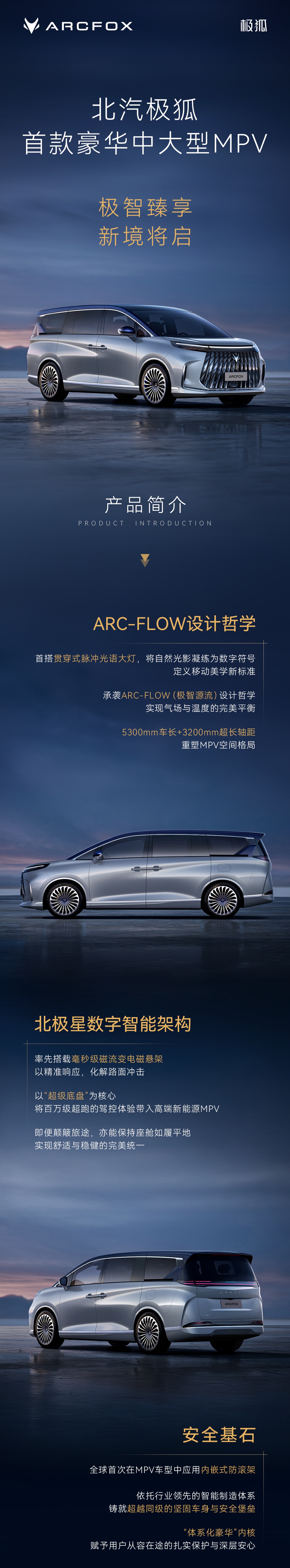 据介绍,该车承袭 ARC-FLOW(极智源流)设计哲学,首搭贯穿式脉冲光语大灯,拥有 5300mm 车长 + 3200mm 轴距。该车还搭载毫秒级磁流变电磁悬架,全球首次在 MPV 中应用内嵌式防滚架,并号称将百万级超跑的驾控体验带入高端新能源 MPV。