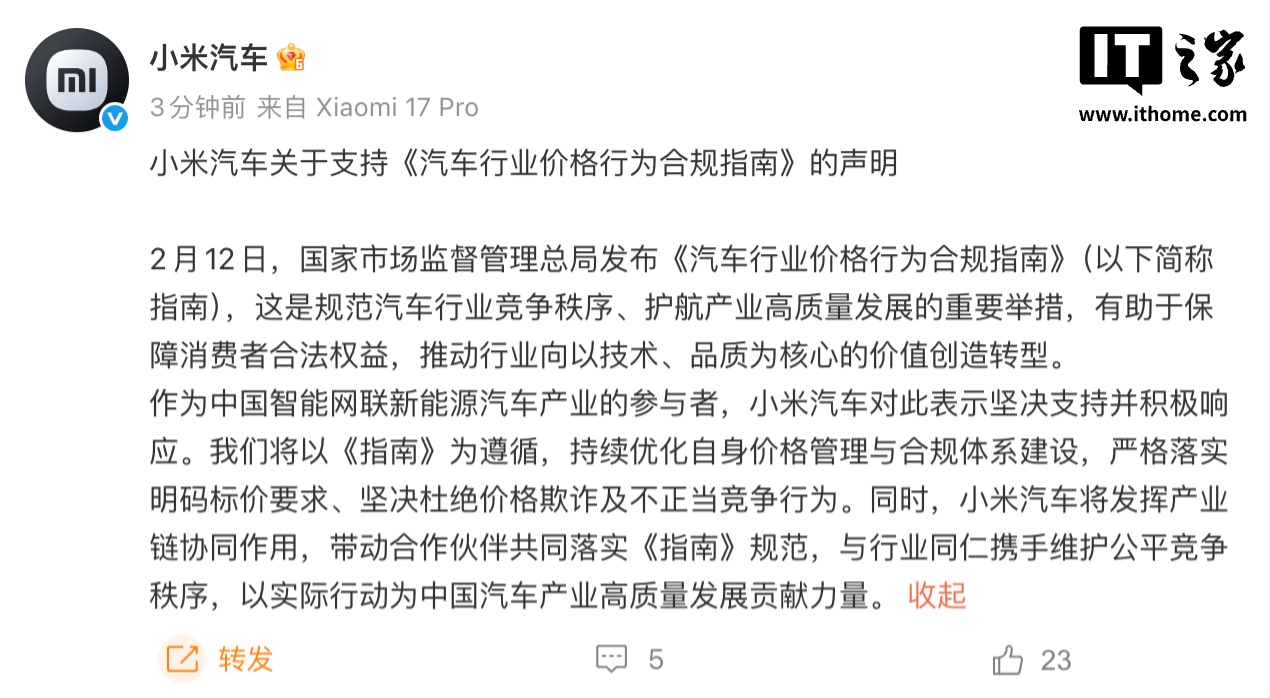 IT之家 2 月 12 日消息,今天傍晚,小米汽车官微发布关于支持《汽车行业价格行为合规指南》的声明: