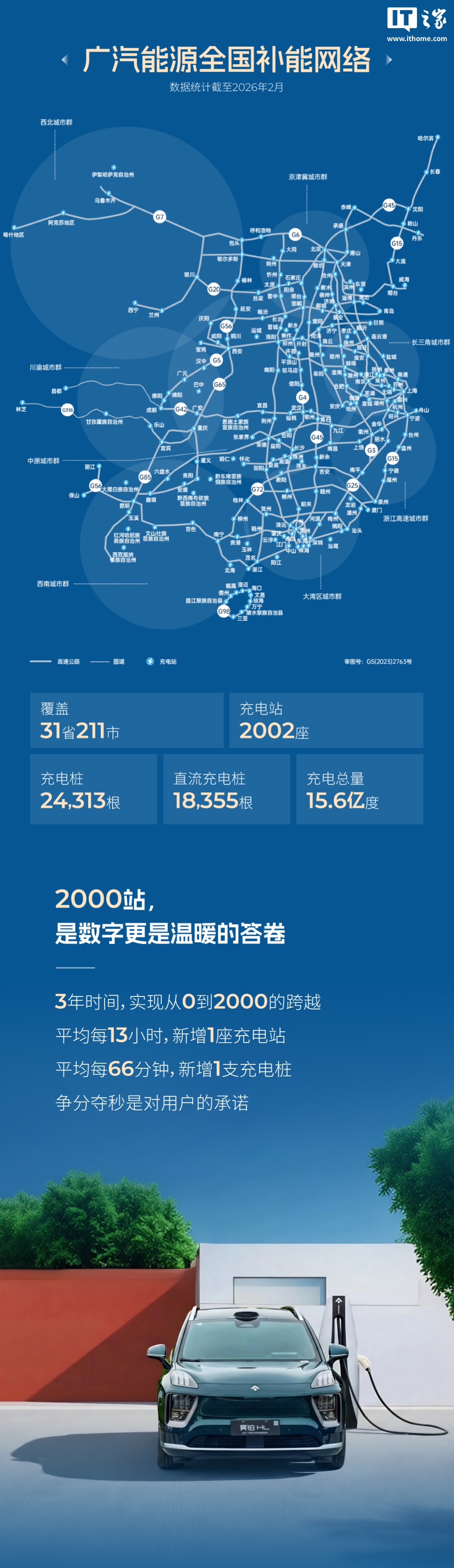 据介绍,广汽能源全国补能网络(数据统计截至 2026 年 2 月)覆盖 31 省 211 市,充电桩 24313 根、直流充电桩 18355 根、充电总量 15.6 亿度。