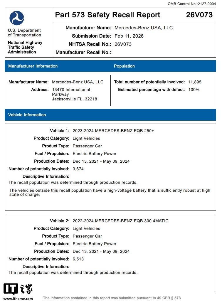 IT之家查询官方公告获悉,此次召回的原因是其高压电池(EB330)可能因内部短路导致热失控和起火风险,影响车型主要为 2022-2024 款 EQB 系列车型。