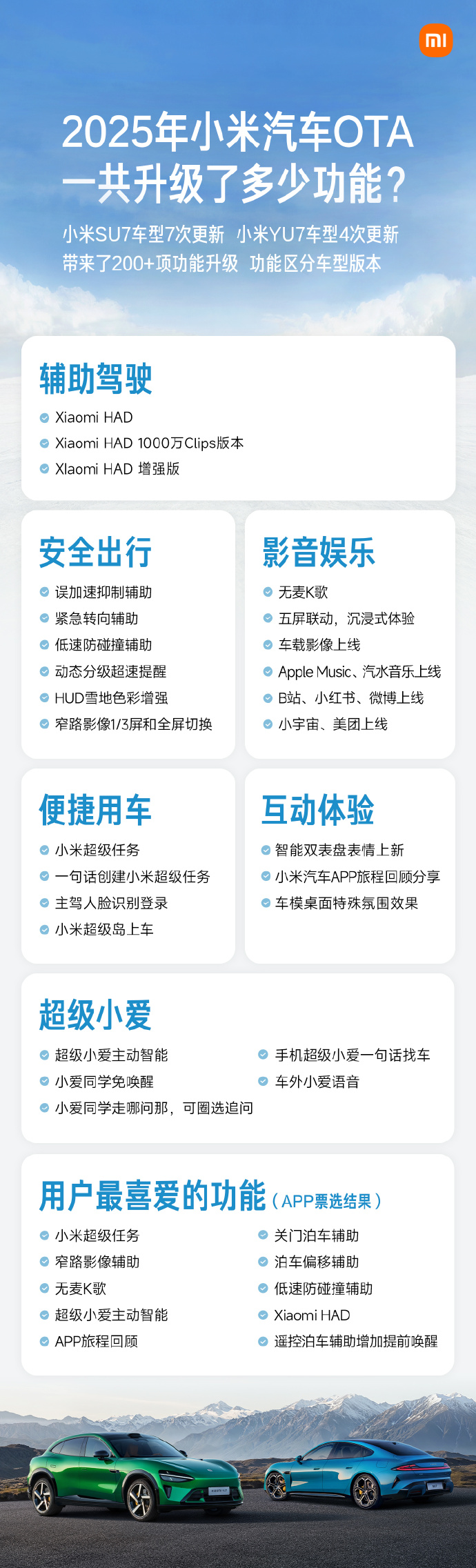IT之家 2 月 13 日消息,小米汽车昨日公布数据,2025 年小米 SU7 车型 7 次更新,小米 YU7 车型 4 次更新,一共带来了 200+ 项功能的更新。