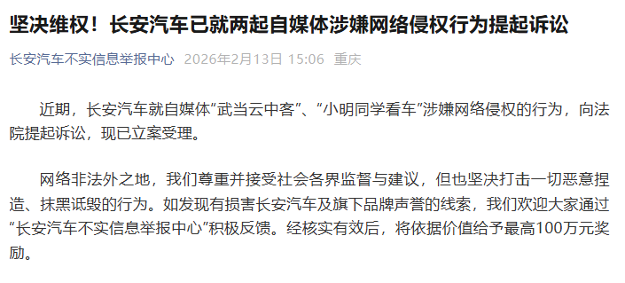 IT之家 2 月 13 日消息,据“长安汽车不实信息举报中心”公众号,近期,长安汽车就自媒体“武当云中客”、“小明同学看车”涉嫌网络侵权的行为,向法院提起诉讼,现已立案受理。