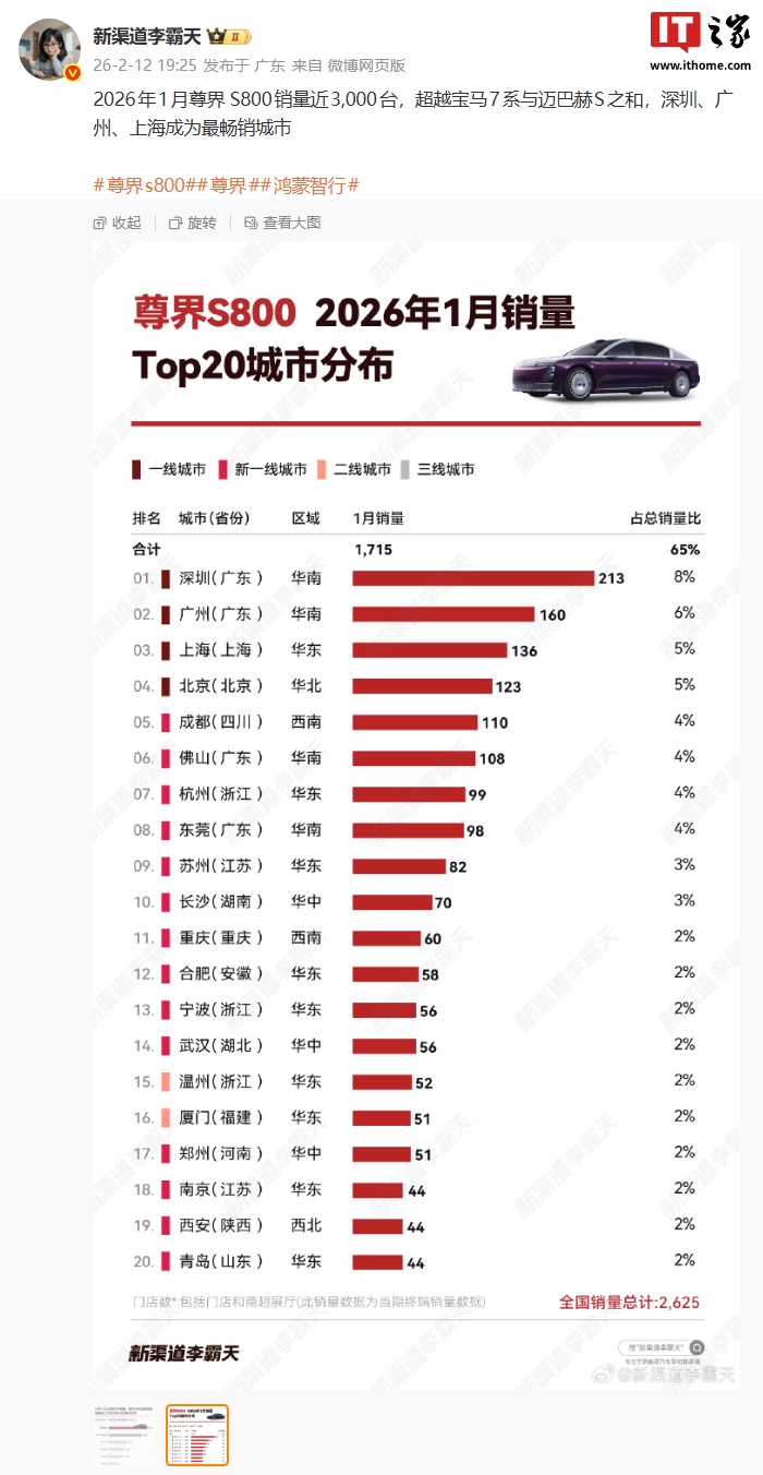 IT之家 2 月 15 日消息,博主 @新渠道李霸天 透露数据:2026 年 1 月,鸿蒙智行尊界 S800 销量近 3000 台(2625 台),超越宝马 7 系(第二名)与迈巴赫 S 级(第三名)之和,深圳、广州、上海成为最畅销城市。图片显示,尊界 S800 依旧位居大型豪华轿车销量 TOP1。