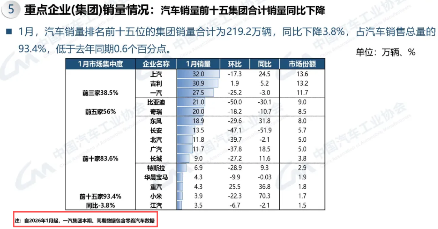 日前,中汽协在发布的2026年1月汽车工业产销情况中表示,1月,汽车销量排名前十五位的集团销量合计为219.2万辆,同比下降3.8%,占汽车销售总量的93.4%,低于去年同期0.6个百分点。
