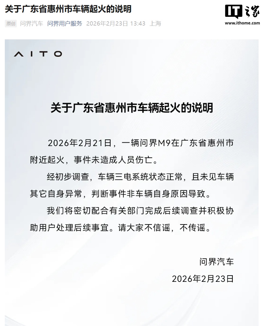 IT之家 2 月 23 日消息,问界汽车今日发布关于广东省惠州市车辆起火的说明,IT之家附全文如下: