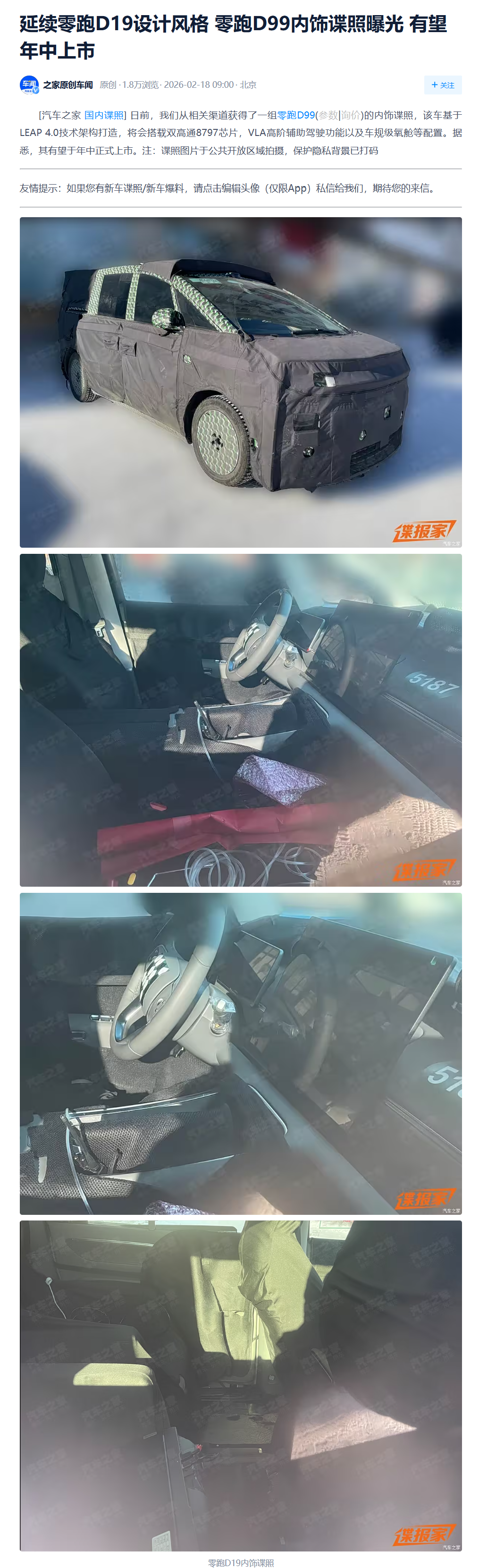 汽车之家上周爆料了 D99 的一组内饰谍照,可以看到新车前排延续零跑 D19 的设计风格,配有悬浮式中控屏、液晶仪表、怀挡、三辐式方向盘、电子门把手,后排预计配备零重力座椅。