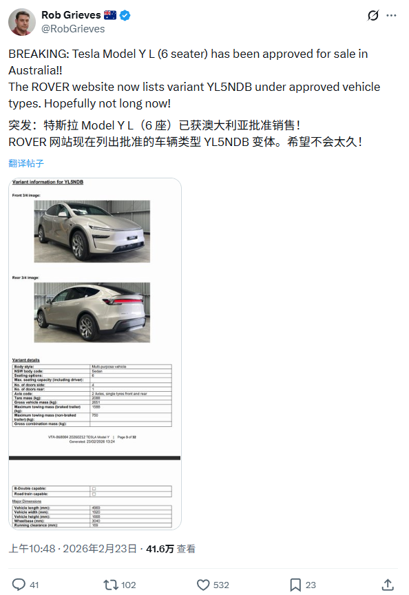 特斯拉爱好者 Rob Grieves 昨日发现,澳大利亚政府的 ROVER 车辆认证网站上已列出型号为 YL5NDB 的 Model Y L 车型,证实特斯拉已获得监管许可。