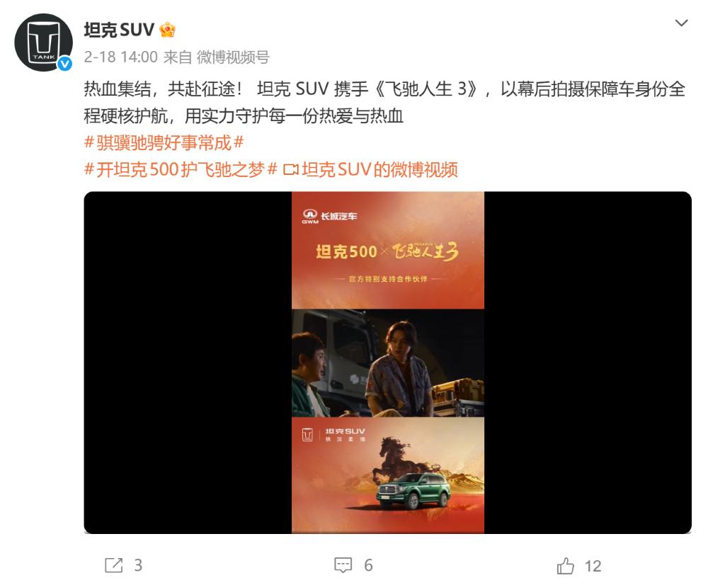 长城旗下的坦克汽车“另辟蹊径”,以幕后拍摄保障车身份的参与了《飞驰人生3》的拍摄。