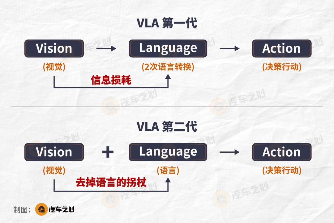语言是离散的,而控制信号 (车辆转向、加速) 是连续量。传统 VLA 很难精确控制物理系统,限制了模型在复杂场景下的表现。第二代 VLA 拆掉语言转译环节,就能简化训练方式,直接输出物理世界 Action。