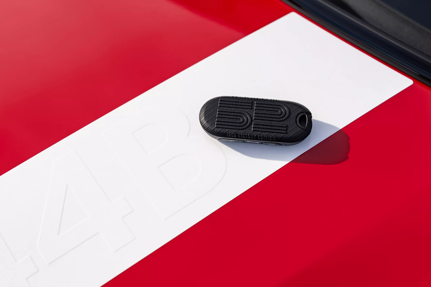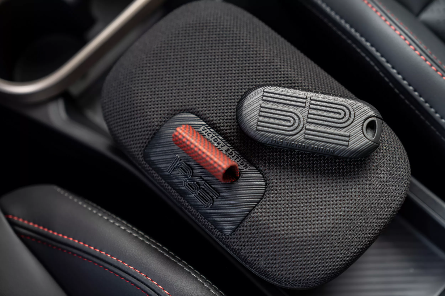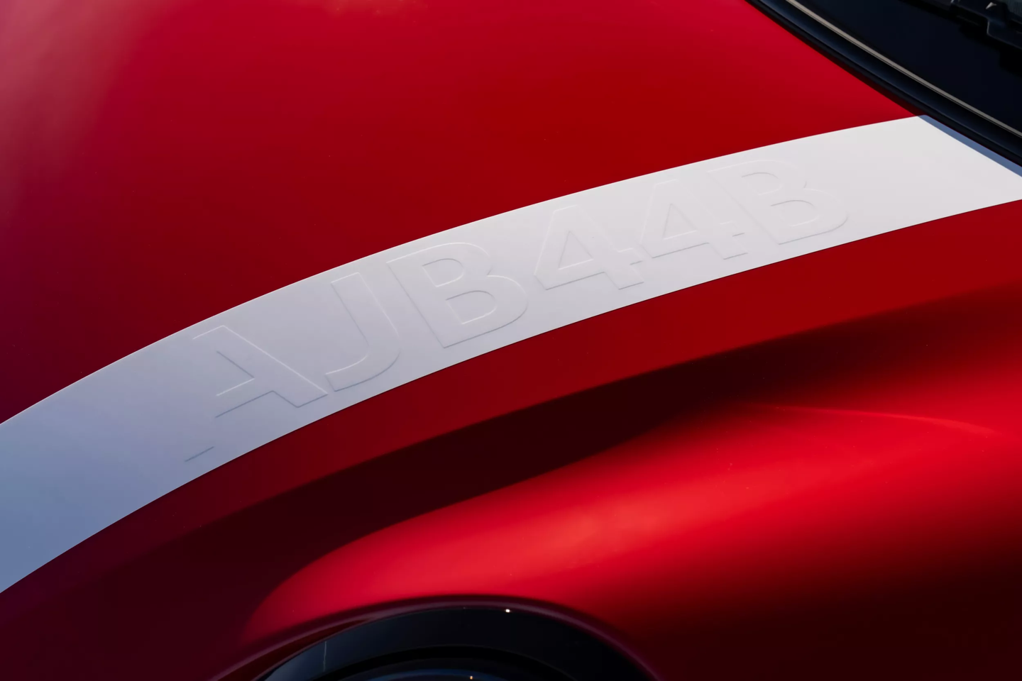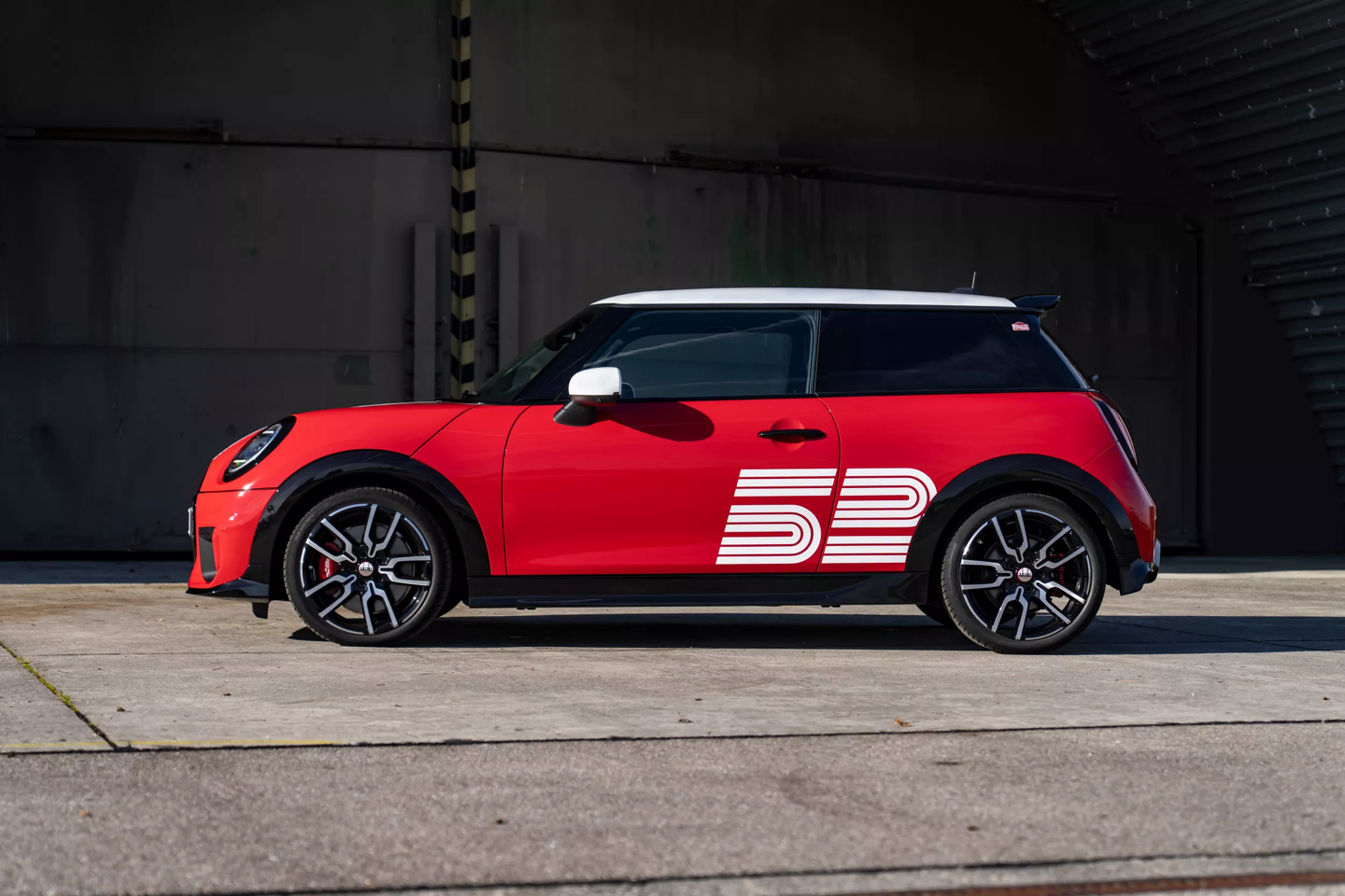 外观方面,该车采用了惹眼的辣椒红(Chili Red)车漆,车身贯穿有白色拉花。车侧印有醒目的白色“52”数字拉花,同时 C 柱贴有“1965”专属贴纸,车顶则配备了全景玻璃天窗。