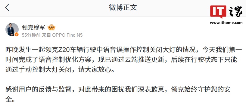 IT之家 2 月 26 日消息,领克汽车销售有限公司副总经理穆军今日发文,回应了领克 Z20 车辆在行驶中语音误操作控制关闭大灯的情况,并表示今天第一时间完成了语音控制优化方案。