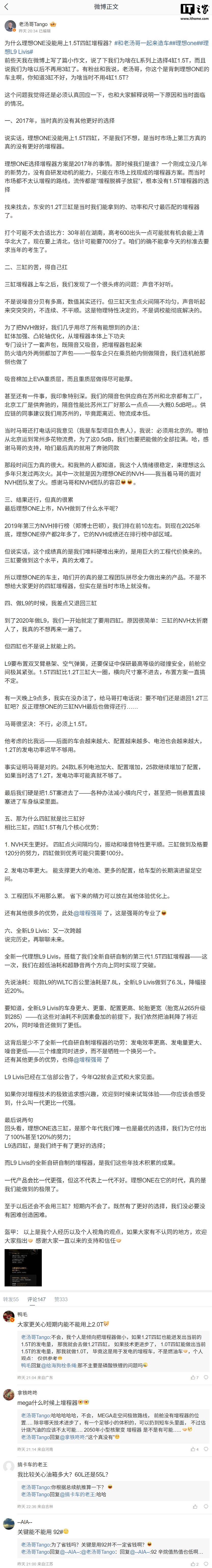 IT之家 2 月 27 日消息,理想汽车产品线负责人汤靖 2 月 26 日晚发文,谈到了理想 ONE 为何没能用上 1.5T 四缸增程器。