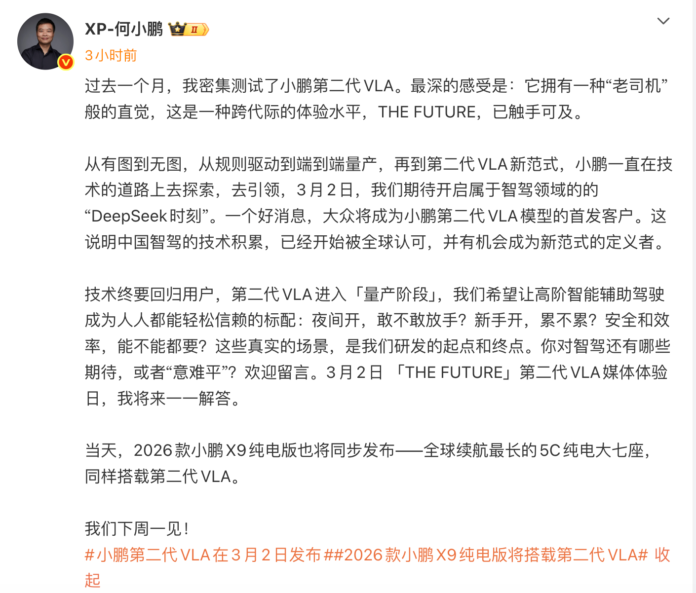 小鹏汽车董事长何小鹏发文透露,大众将成为小鹏第二代VLA模型的首发客户。