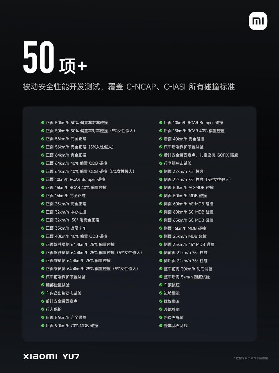 对于已经上市的小米 YU7 车型,该车型同样采用钢铝混合材质的铠甲笼式车身结构,设计目标是在前向碰撞、侧向碰撞、后向碰撞及翻滚等多维度事故场景中为乘员舱提供有效被动安全防护。