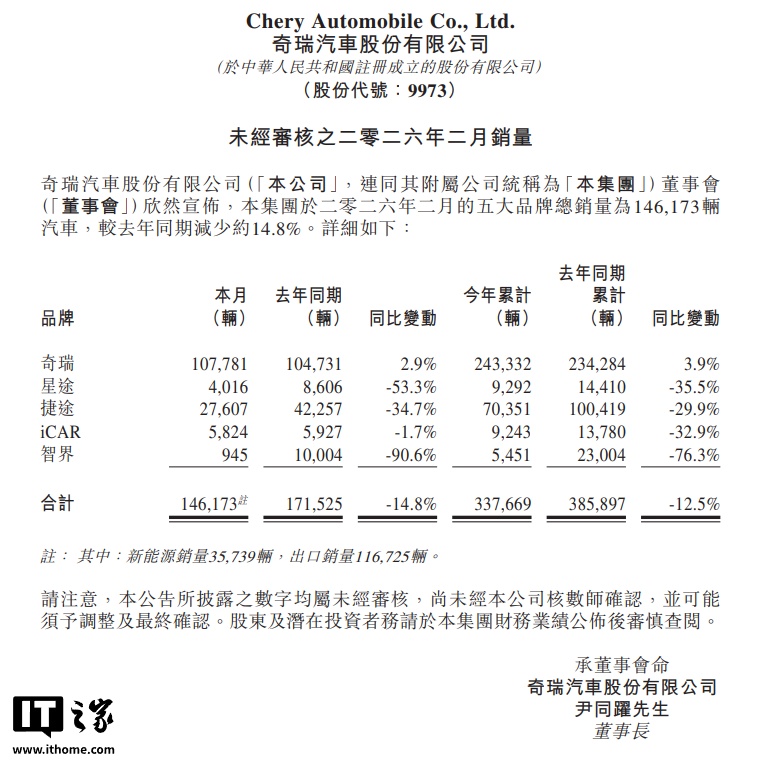 IT之家 3 月 1 日消息,奇瑞集团 2026 年 2 月销售汽车 16.1 万辆;奇瑞汽车 146173 辆,同比下滑 14.8%。