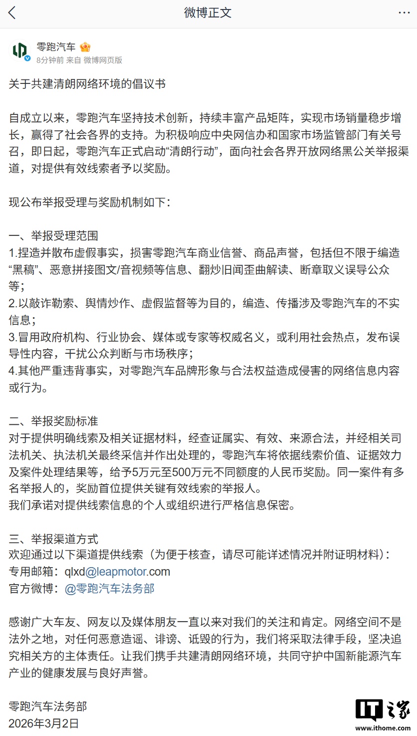IT之家 3 月 2 日消息,零跑汽车法务部今日发布关于共建清朗网络环境的倡议书,即日起,零跑汽车正式启动“清朗行动”,面向社会各界开放网络黑公关举报渠道,对提供有效线索者予以奖励。