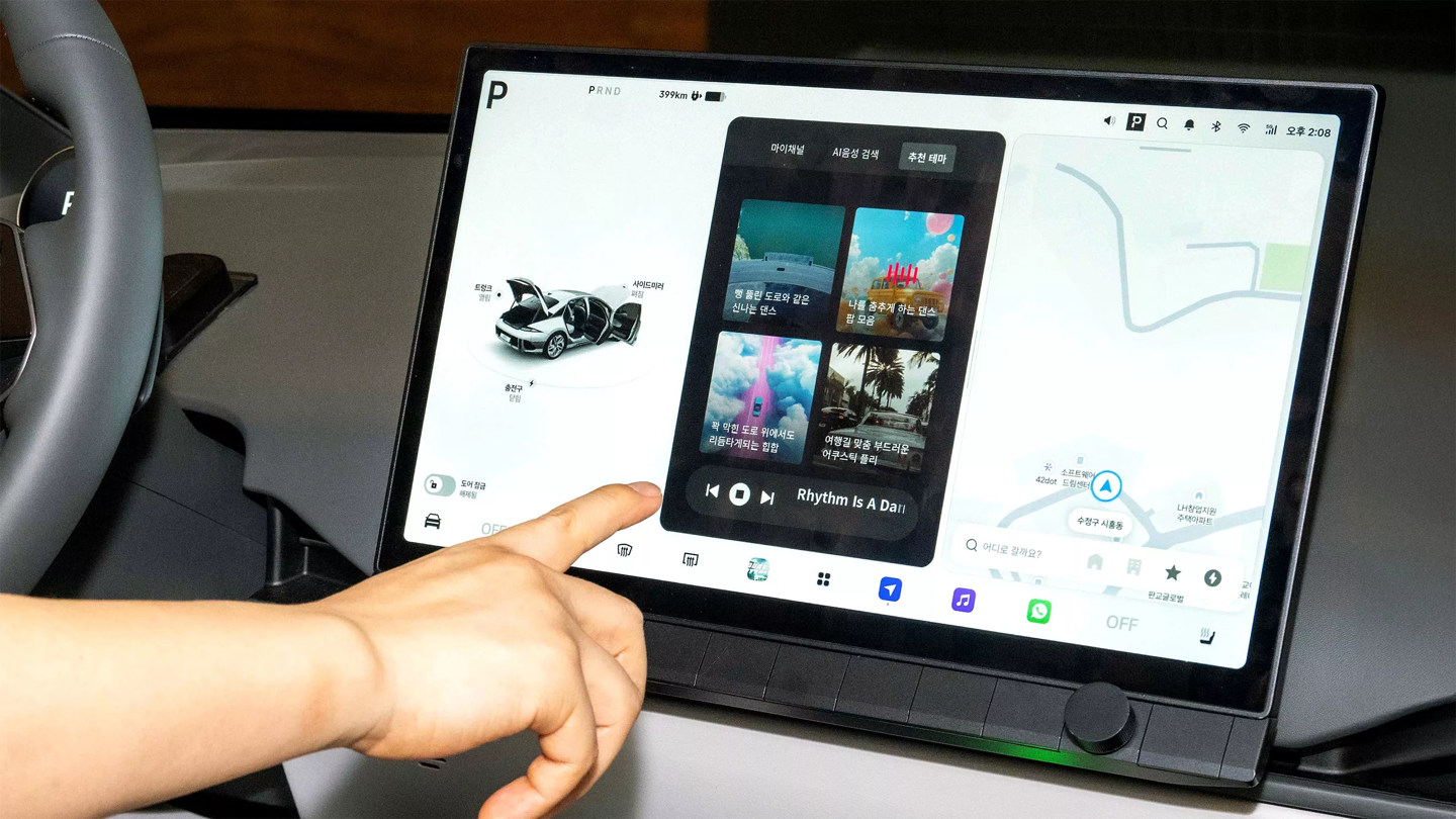 内饰方面,现代预计将首次应用自研的“PLEOS Connect”信息娱乐系统,取消此前的双屏设计,改为大尺寸中控屏搭配细长数字仪表。系统基于 Android Automotive OS,支持应用下载、远程升级以及调用内置语音助手 Gleo AI。