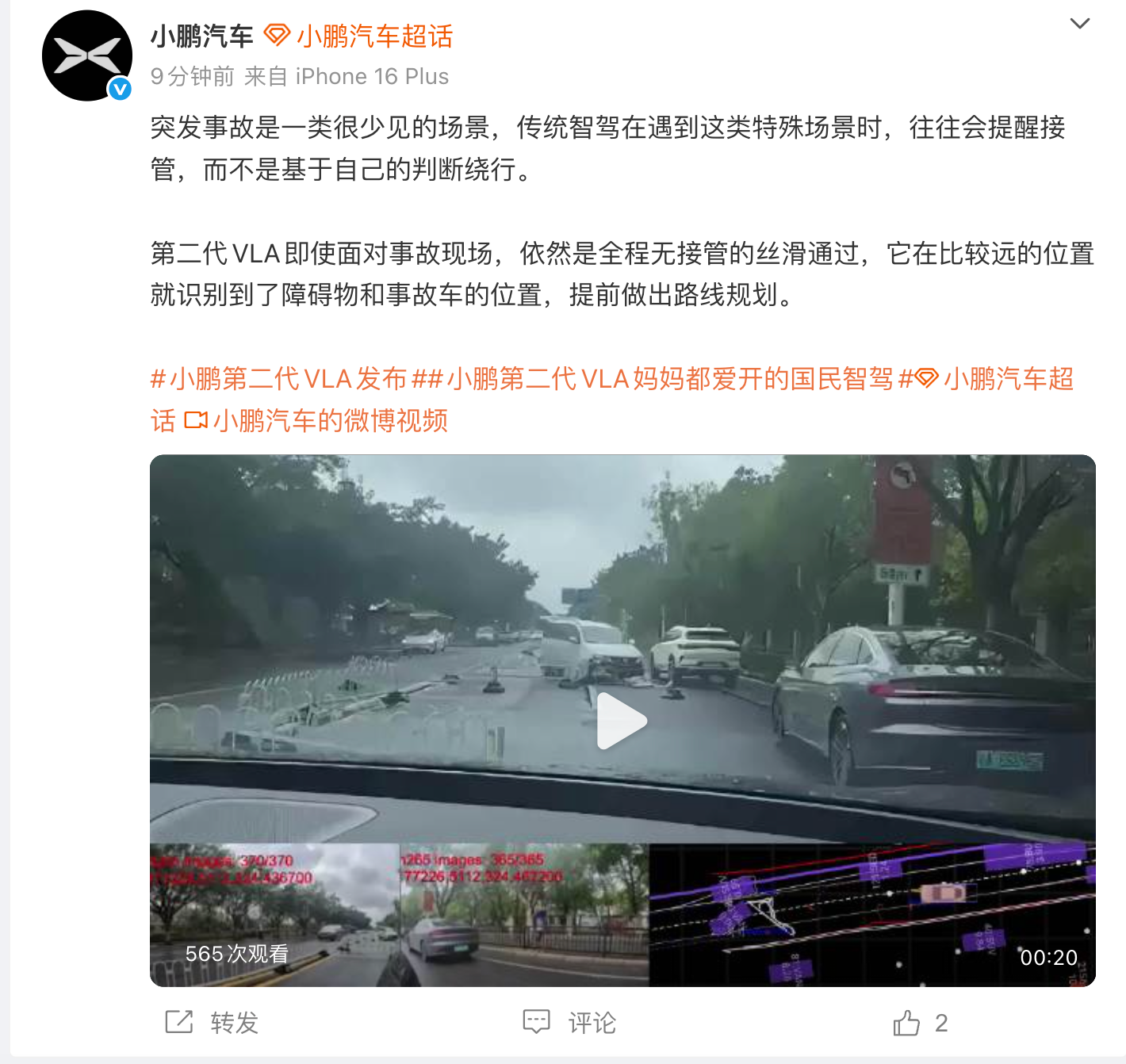 据官方介绍,小鹏第二代VLA“直奔L4终局”,可应对园区小路、乡村土路及无导航路段。演示案例显示,该系统能识别夜间突然出现的行人,并在事故现场提前识别障碍物规划路线,全程无需接管。