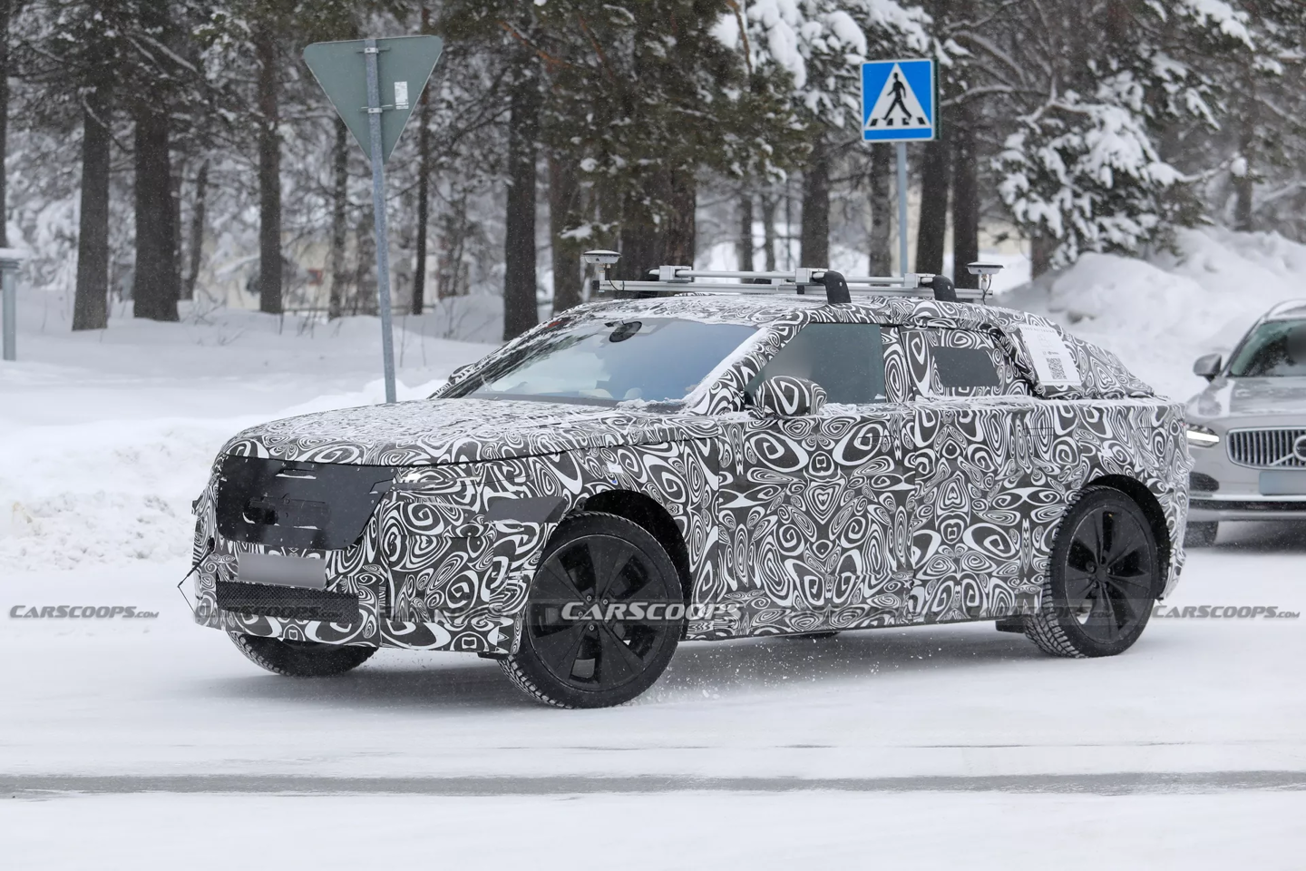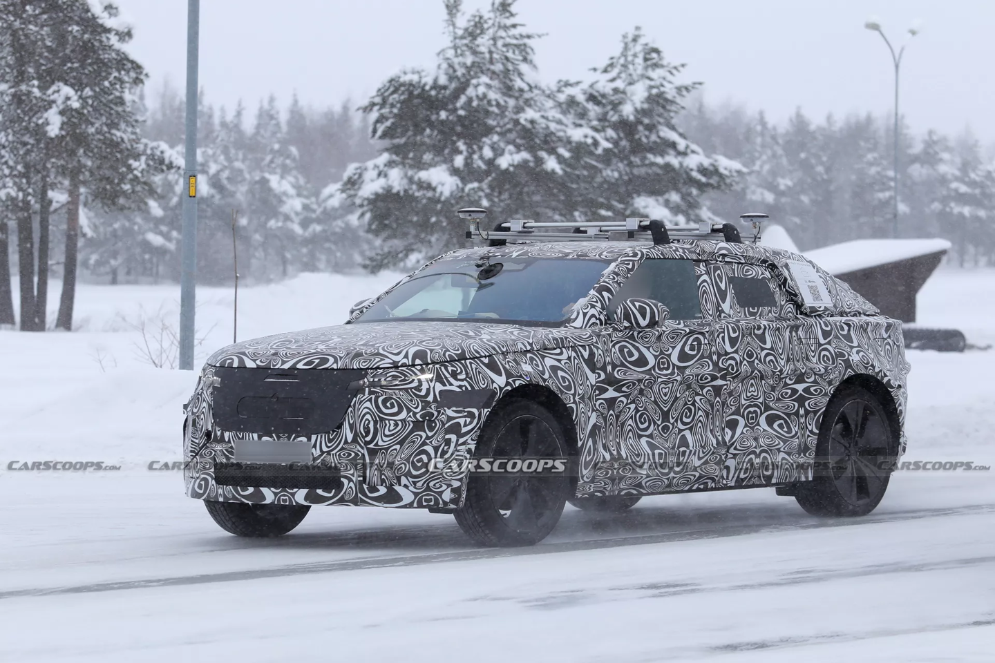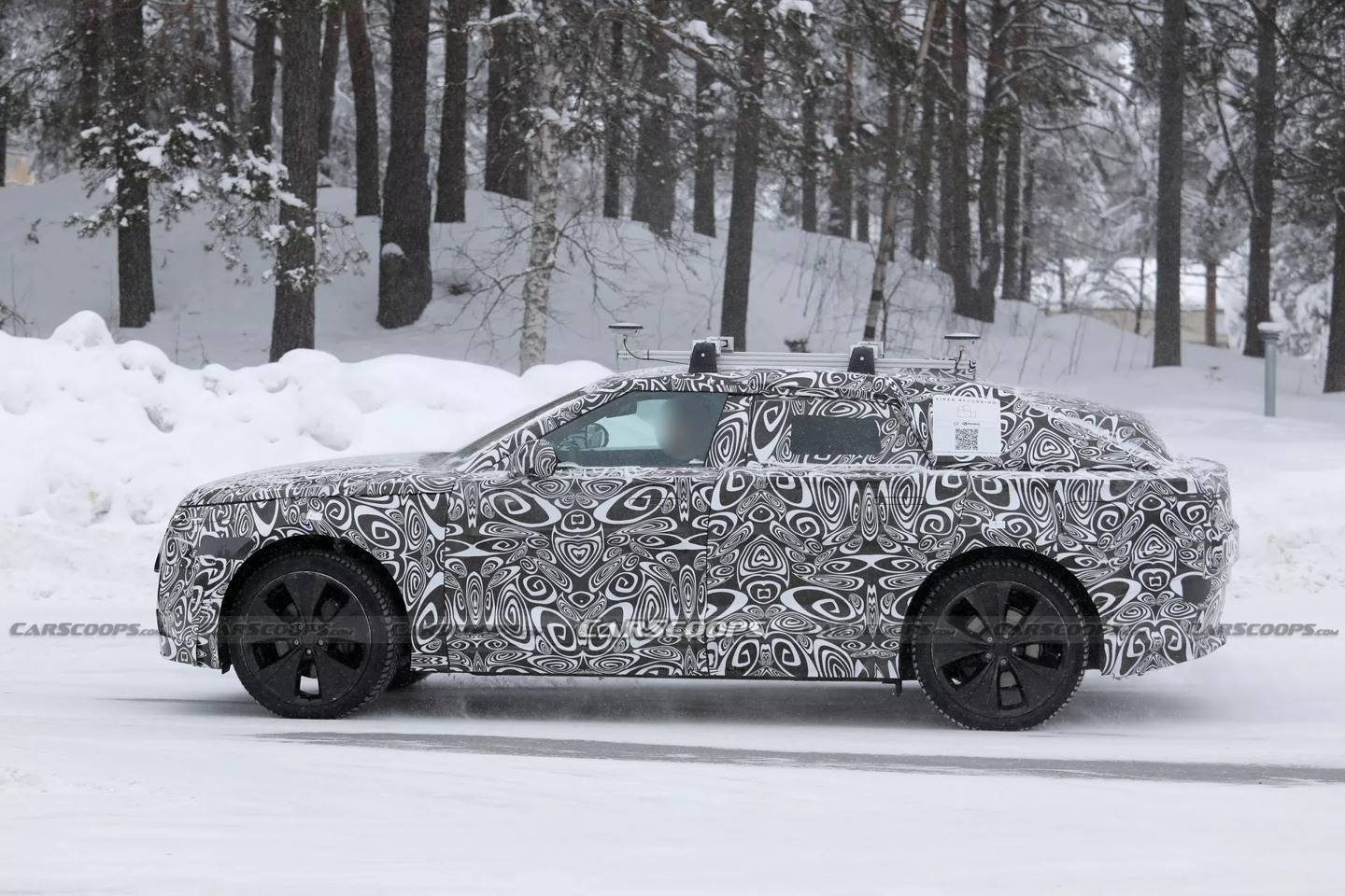 在设计细节方面,新车前脸依然保留了家族式的经典元素,配备了狭长倾斜的大灯组与大尺寸前格栅。测试车不仅展示了隐藏式门把手和车顶行李架,还在车顶配备了两个大型鲨鱼鳍天线以及居中布置的摄像头。