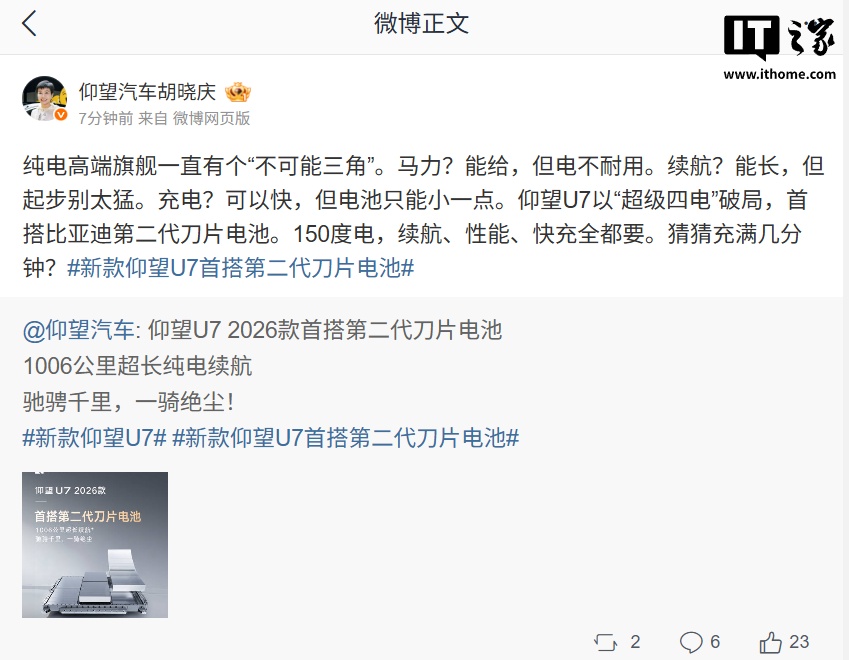 IT之家 3 月 4 日消息,比亚迪仰望汽车今日官宣,仰望 U7 2026 款将首搭第二代刀片电池,1006 公里超长纯电续航(CLTC)。